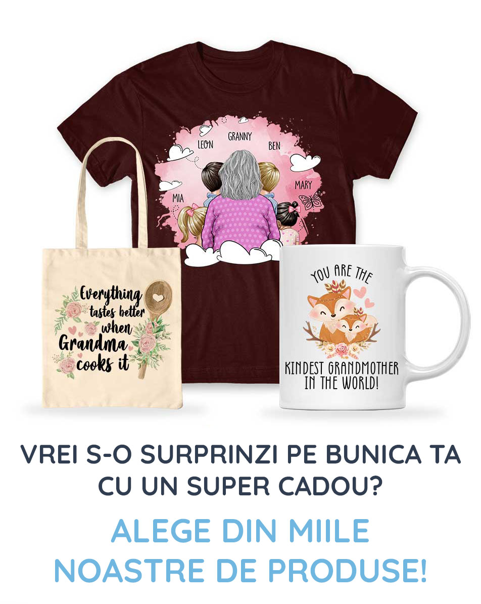 Bunica este cea mai super, iar noi te ajutăm să găsești cadoul perfect pentru ea. Creează un tablou de pânză pentru bunica din fotografiile tale preferate, alege din gama noastră de modele personalizabile sau creează unul propriu! Poți solicita designul ales pe tricou, cană, geantă, față de pernă! Petrece mai mult timp cu bunica ta!